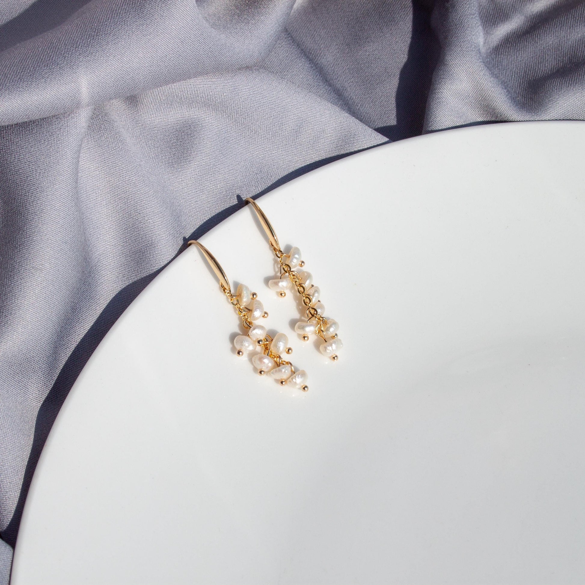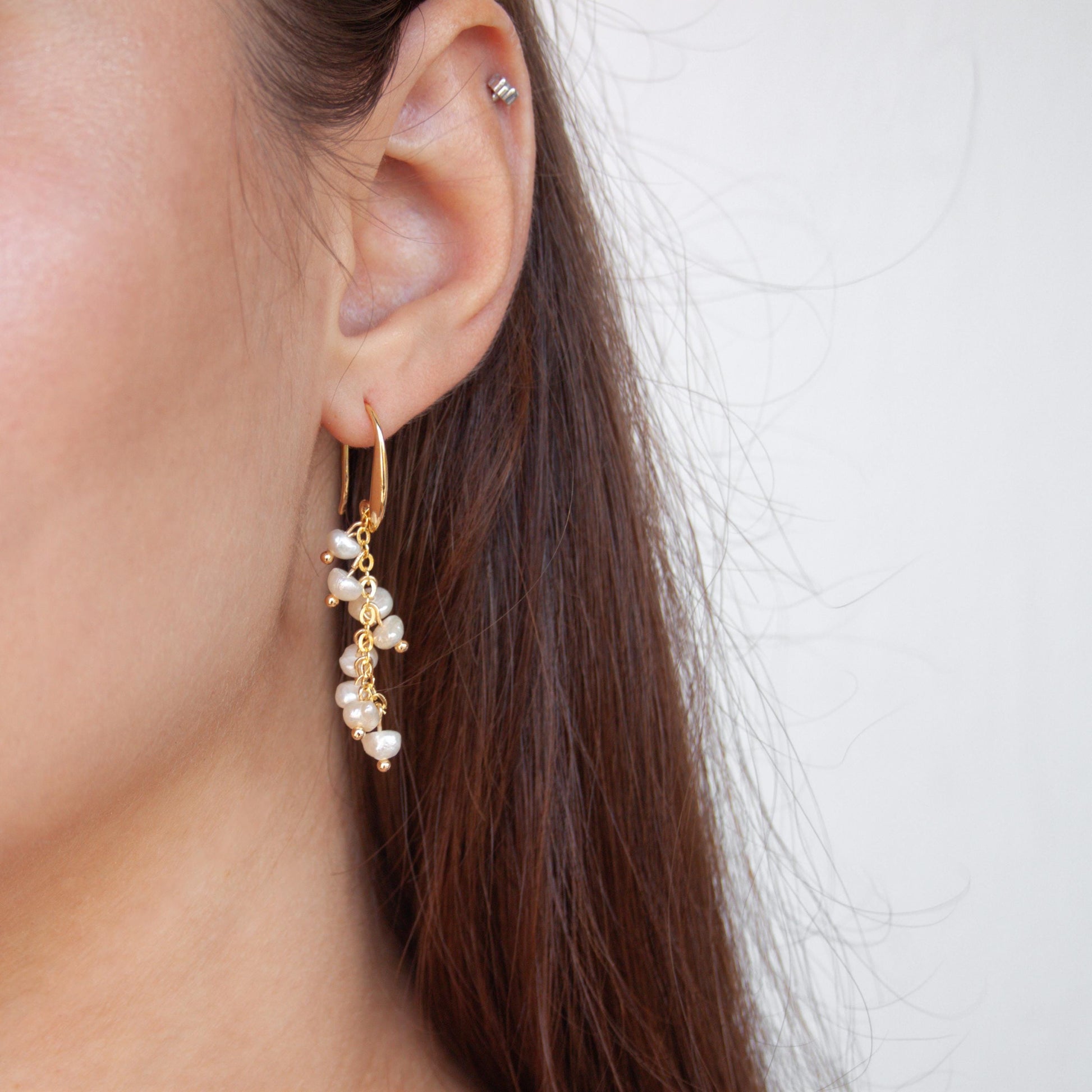 Natural freshwater pearls gather in a gentle cluster, hanging from smooth gold-plated hooks. Their soft luster catches the light with every movement, adding a quiet sophistication to your look. Designed for comfort and balance, these earrings pair beautifully with both modern and classic outfits.