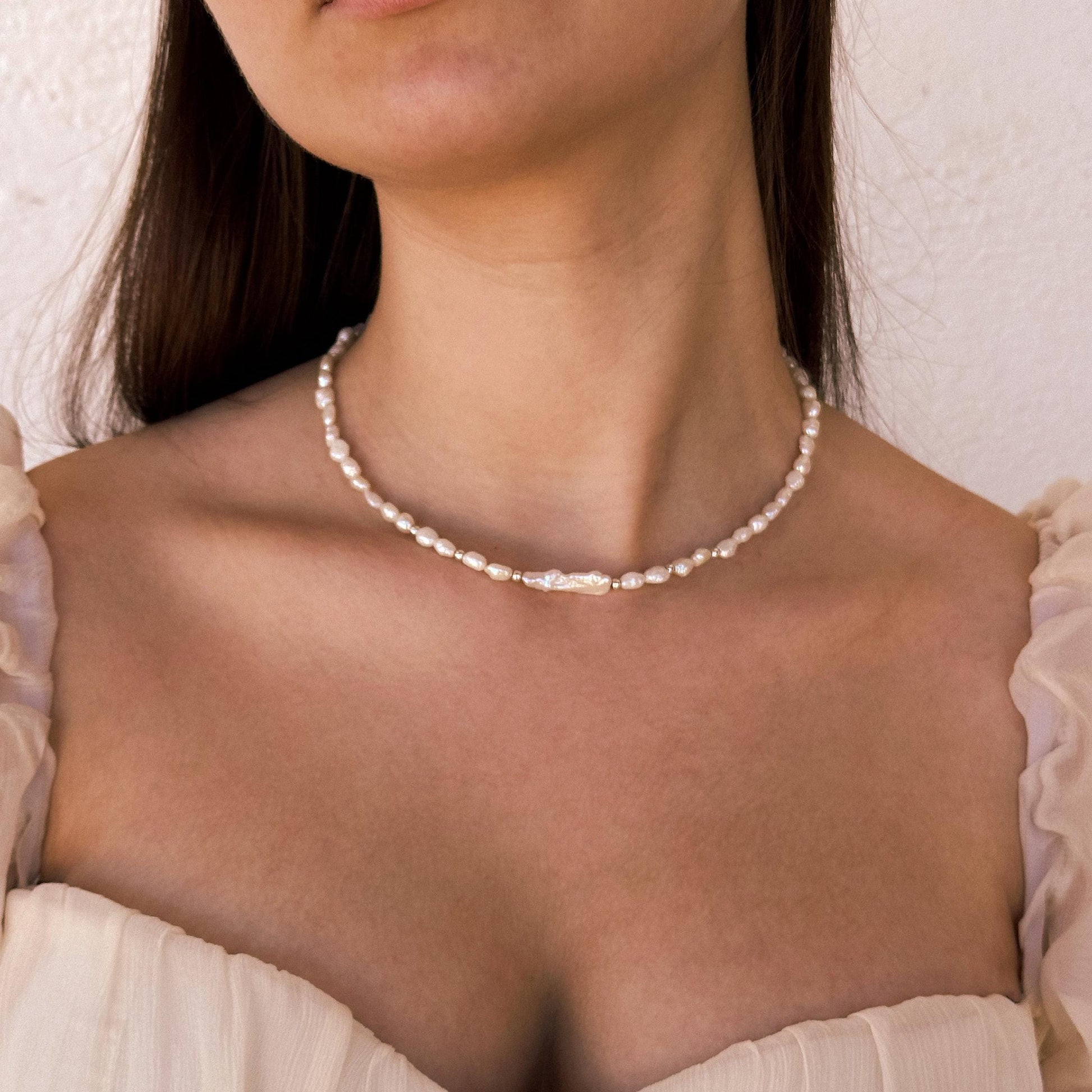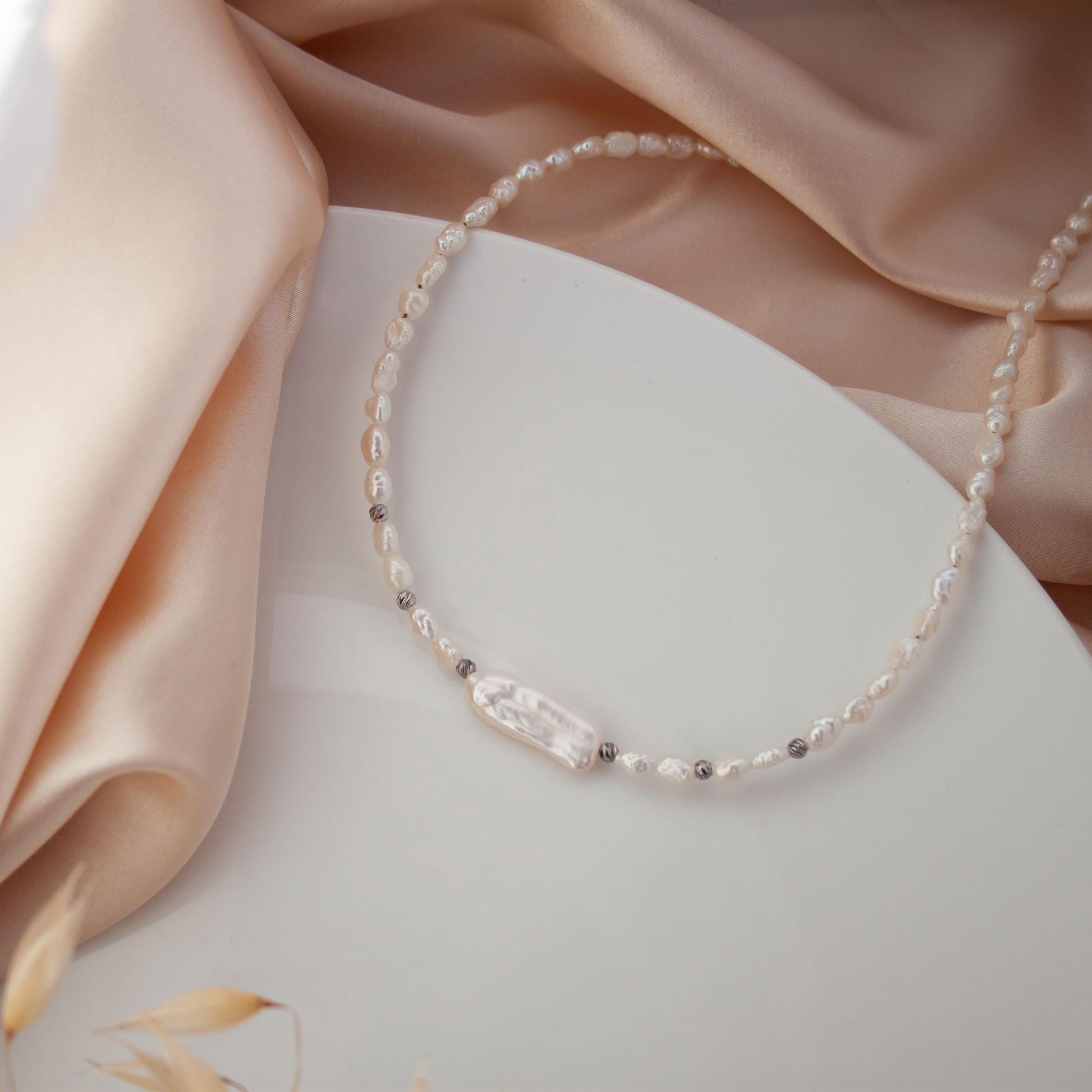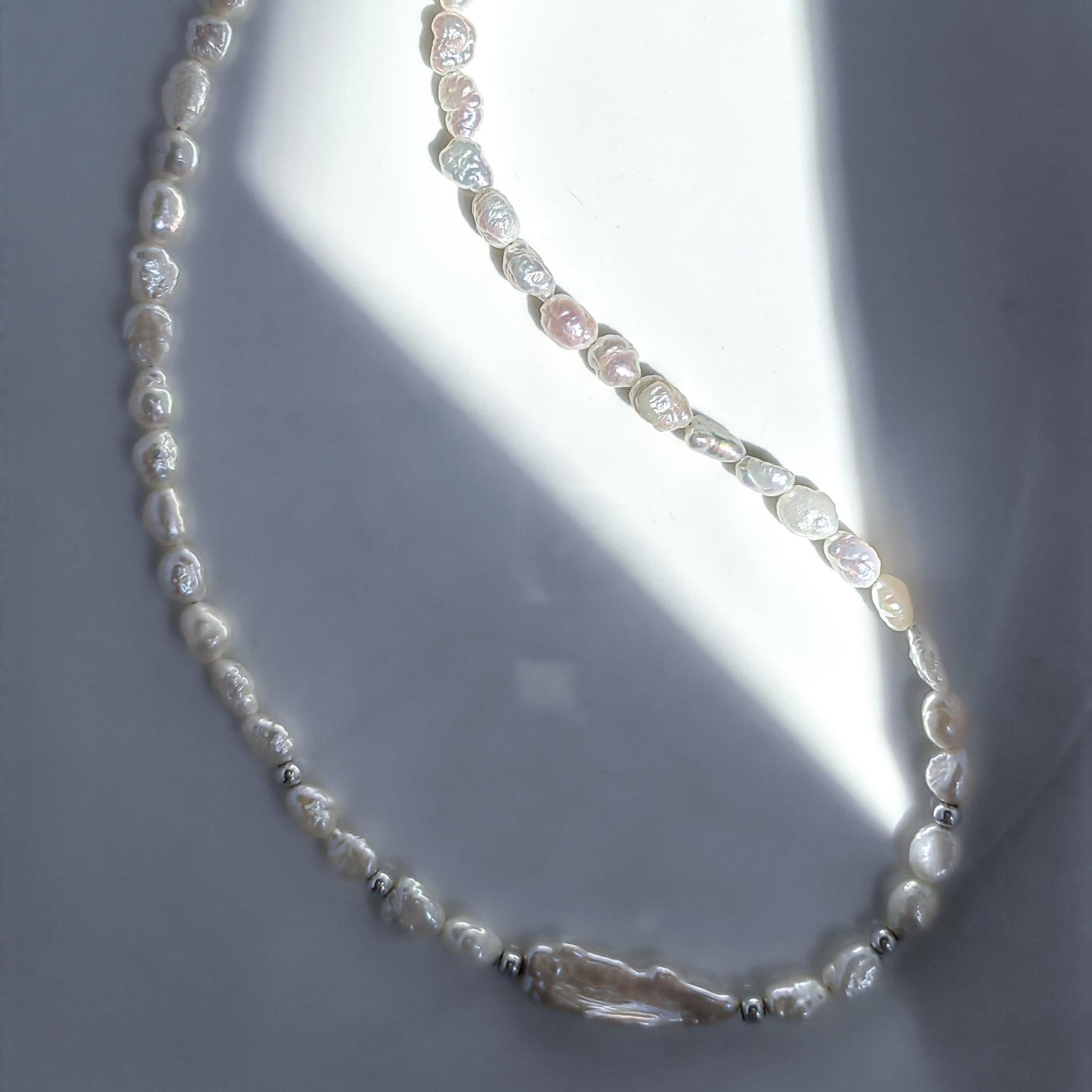 This elegant pearl choker features a long Biwa baroque pearl at its center, surrounded by lustrous freshwater pearls. The combination of organic texture and refined symmetry creates a distinctive, modern design that complements both bridal and everyday looks. A thoughtful gift for weddings, birthdays, or special occasions.