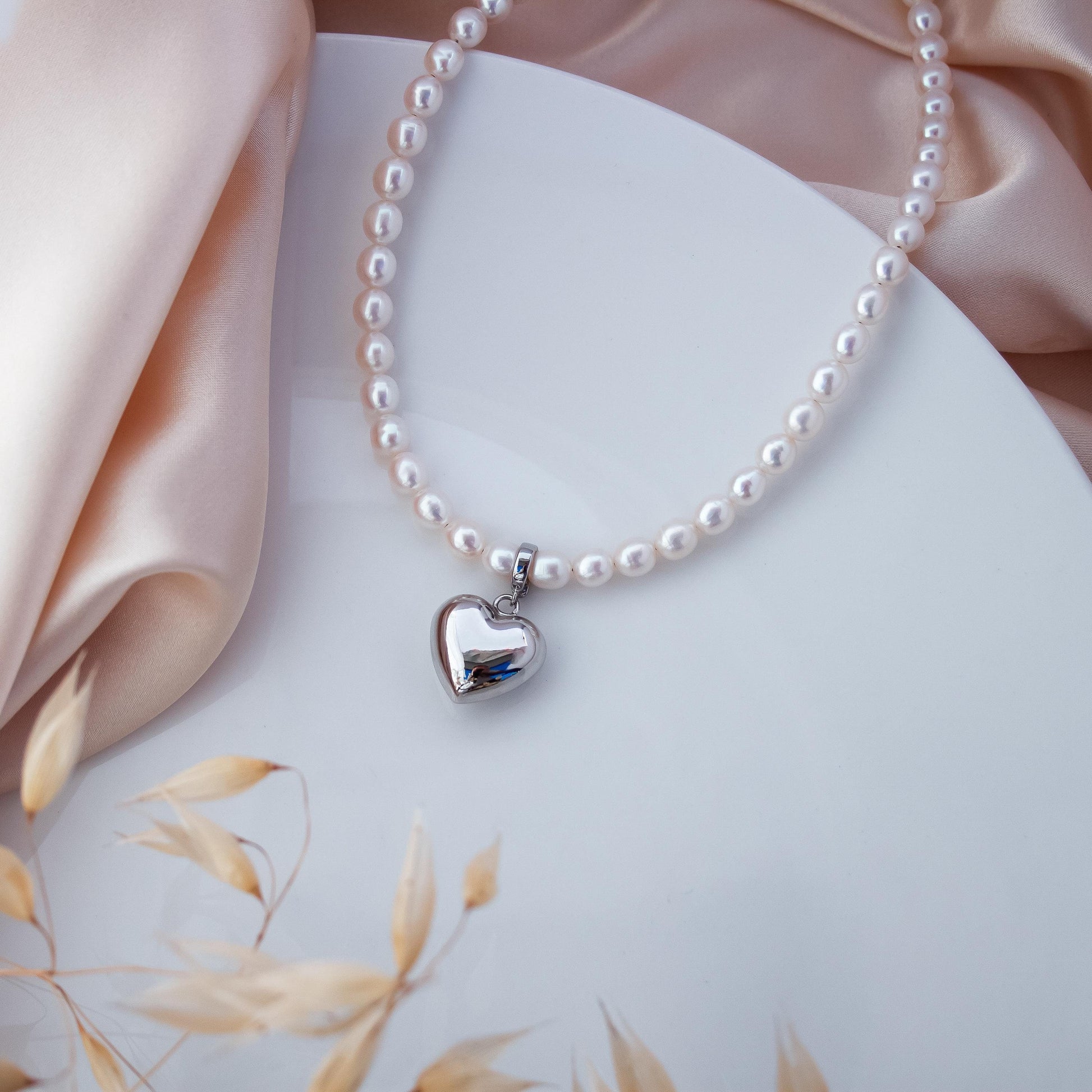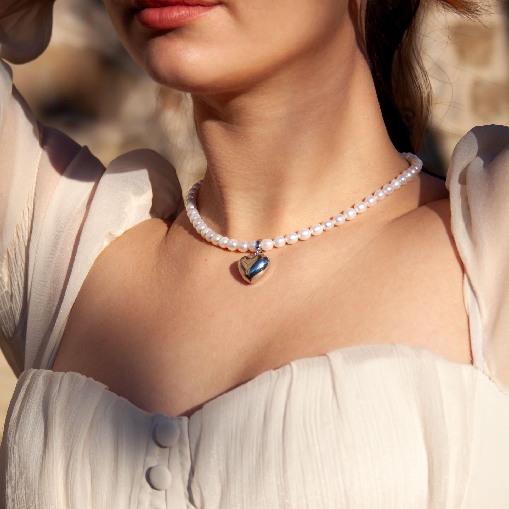 Delicate pearl choker necklace featuring natural freshwater pearls and a polished silver heart pendant. The soft luster of the pearls and the smooth metallic charm create a balanced look - classic yet playful. Perfect for daily wear or as a thoughtful gift for someone special.