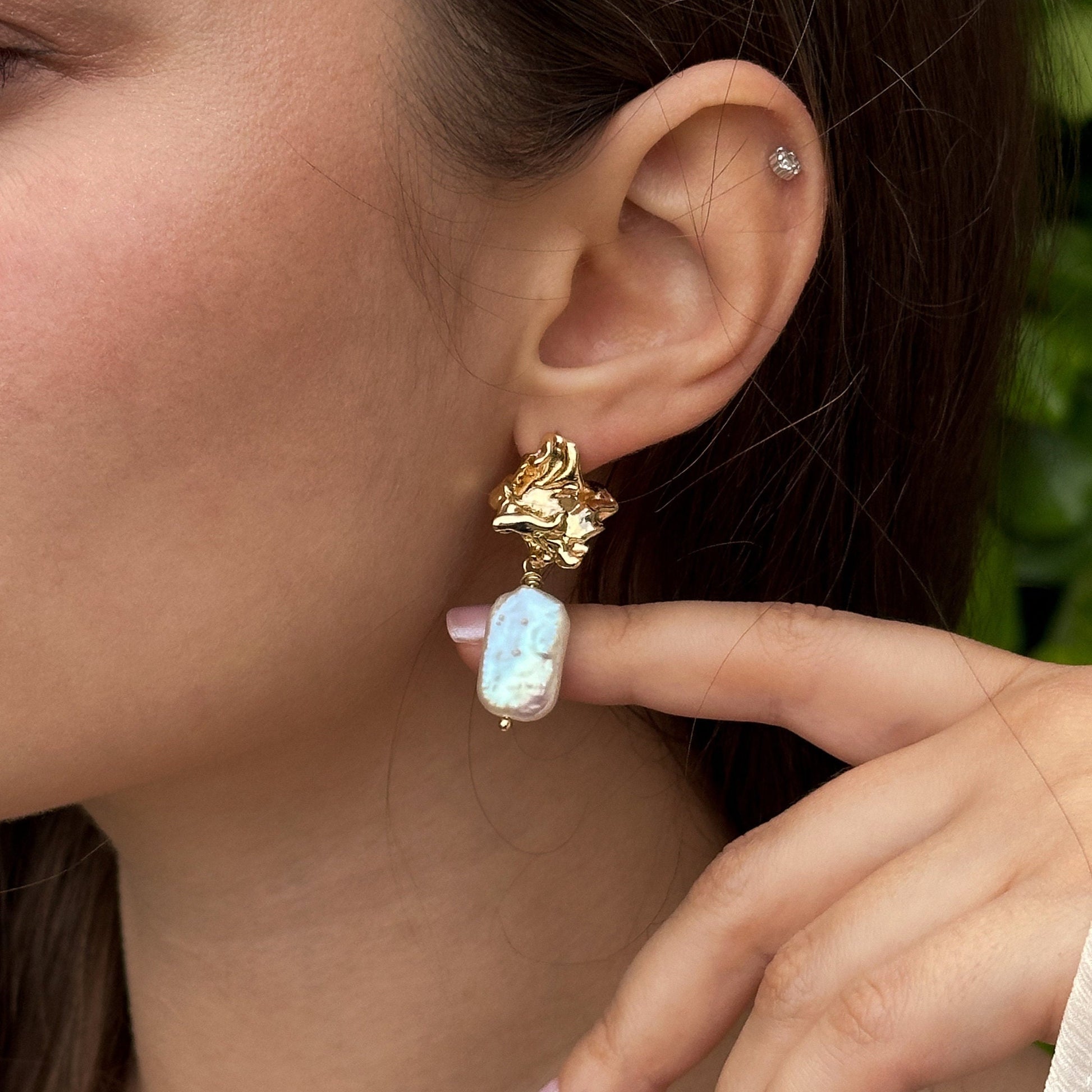 Eye-catching earrings with irregular baroque pearls set on sculpted gold bases. The organic pearl shapes and high-gloss metal create a refined yet bold look. Designed for weddings, evening events, or standout daily wear, they celebrate the natural individuality of each pearl.