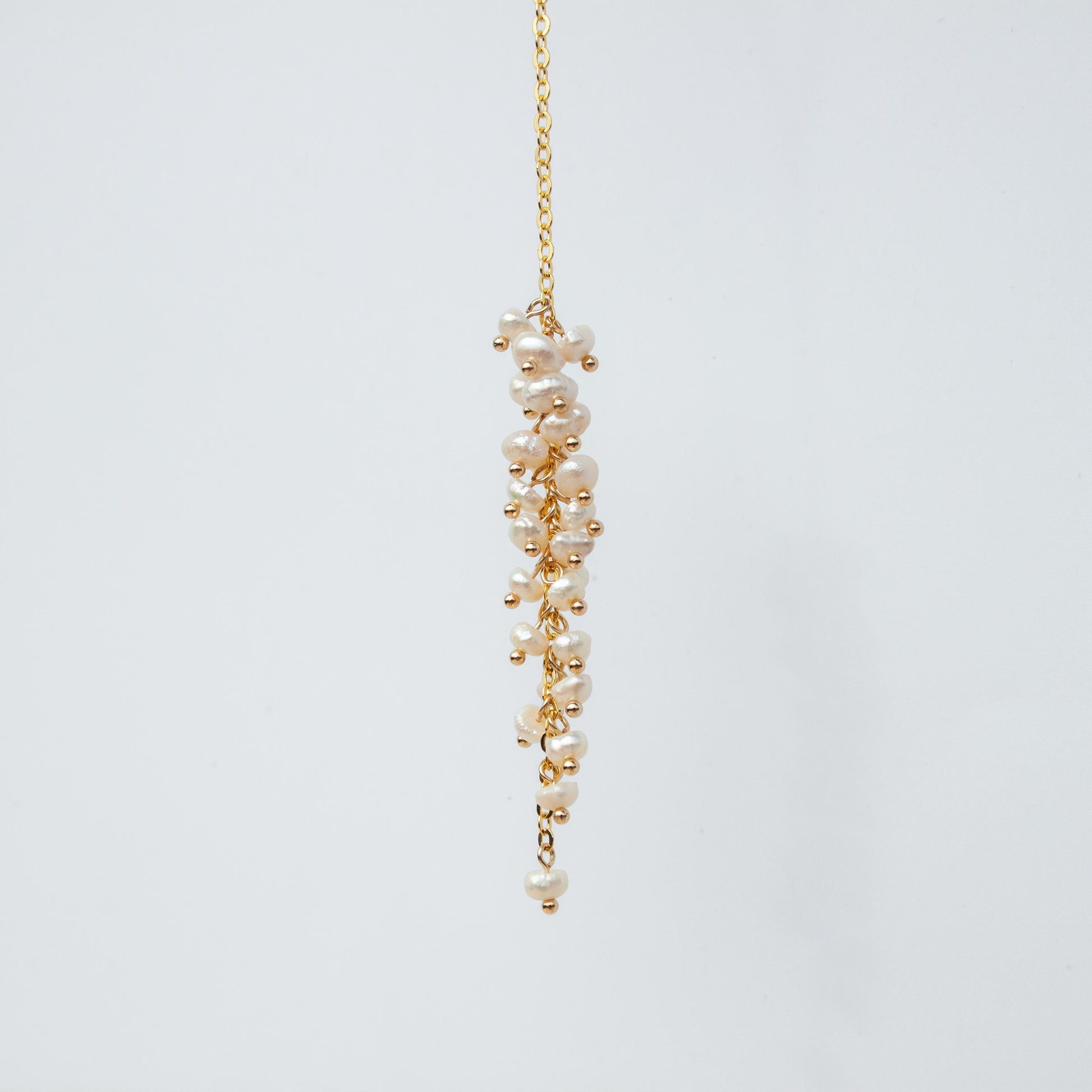 Gold chain necklace with cascading freshwater pearls forming a delicate cluster in a Y-shaped lariat design. The slim profile and gentle shimmer make it perfect for weddings, evening looks, or adding a refined accent to everyday wear. Elegant and feminine, this necklace highlights the natural beauty of pearls with modern balance.