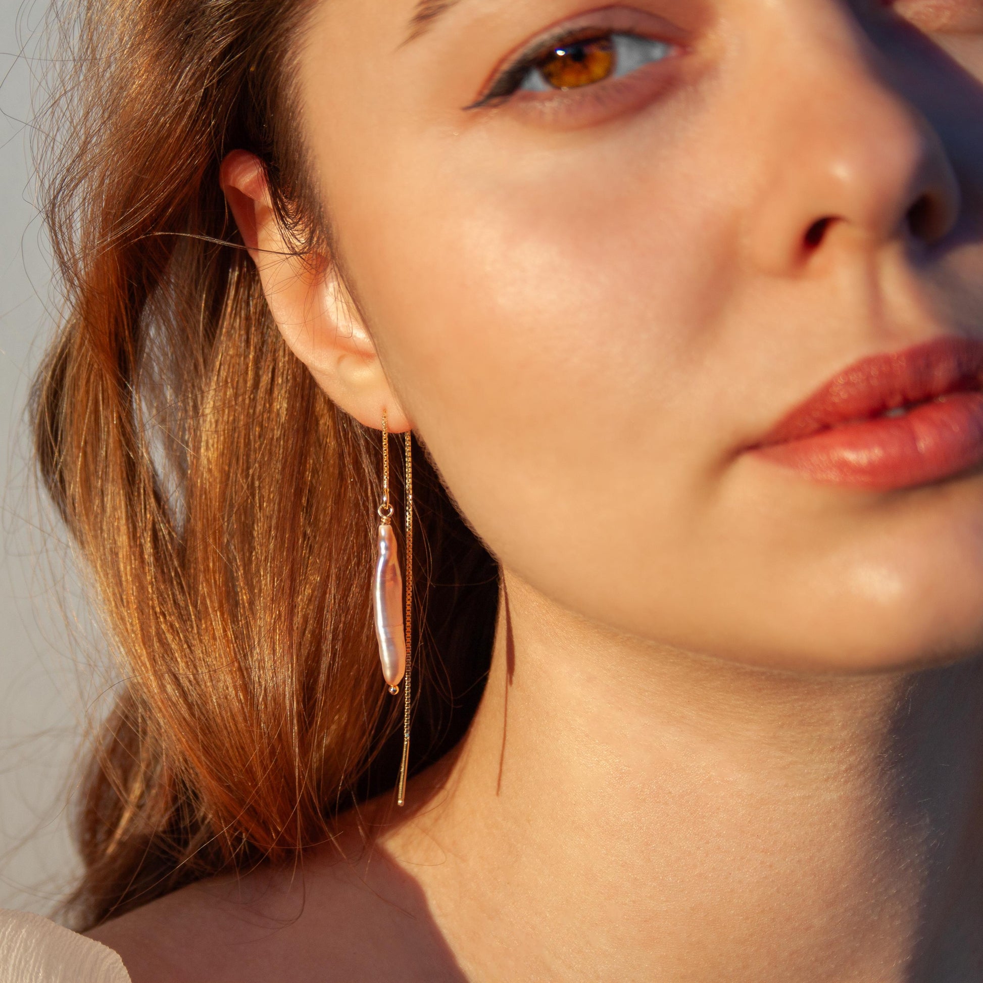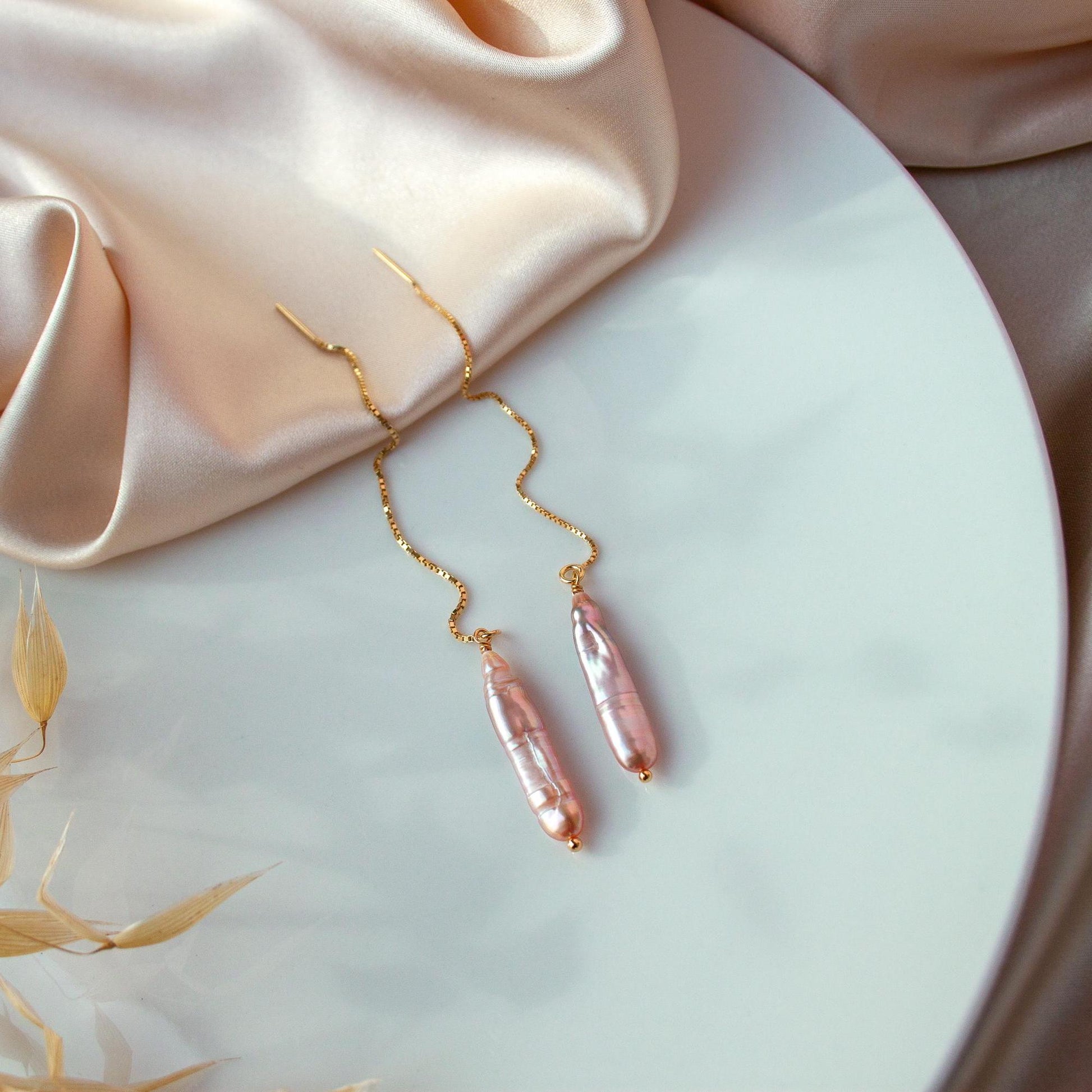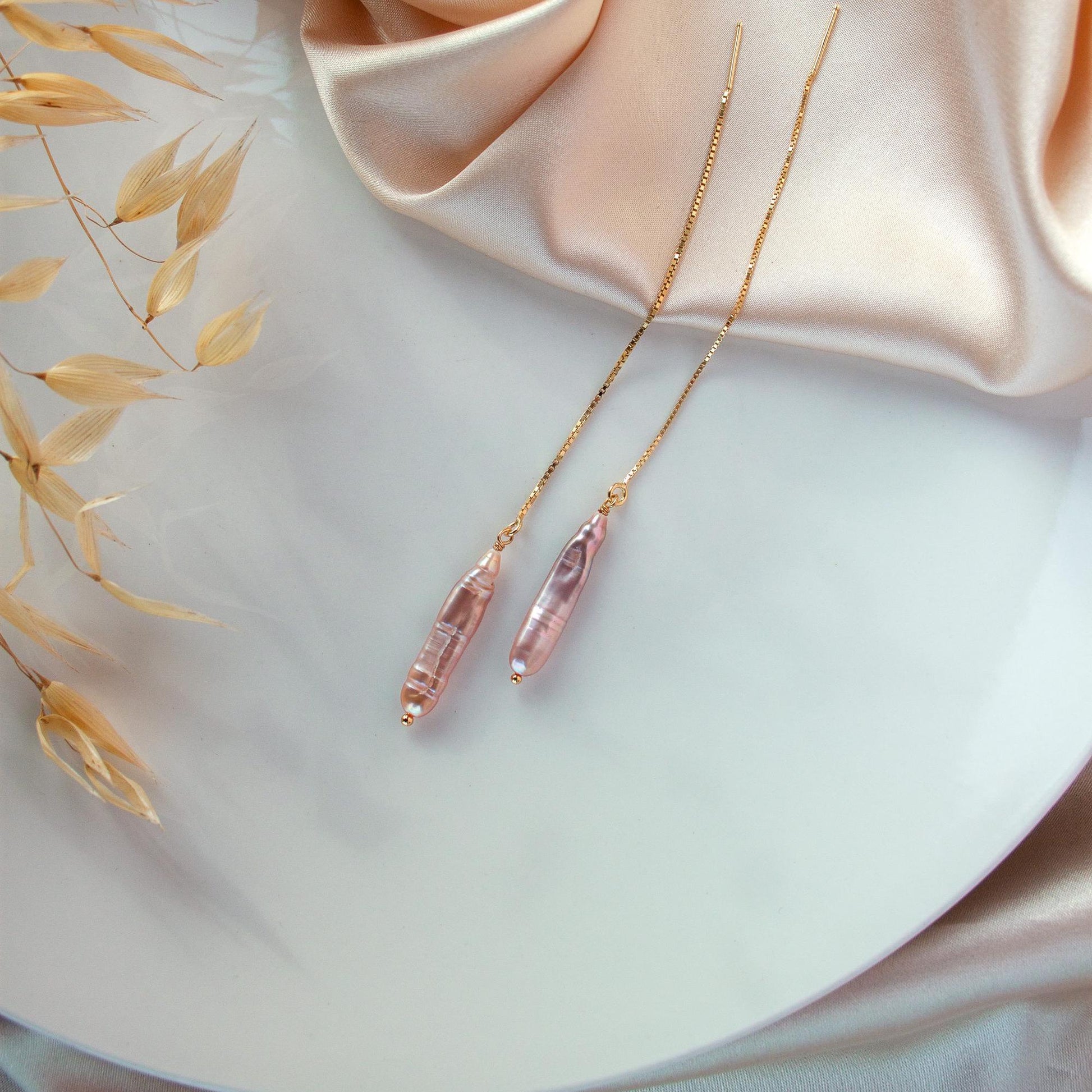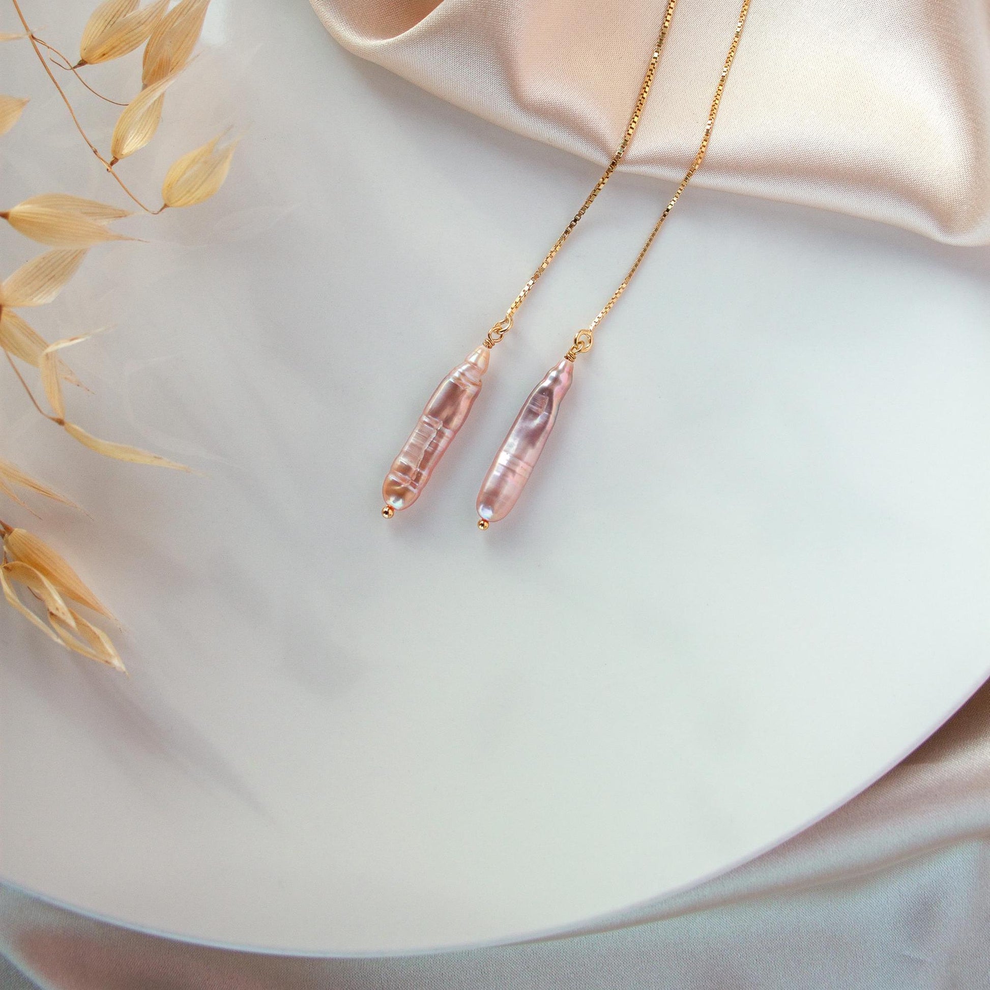 Long pink Biwa pearl threader earrings crafted with natural elongated pearls and a gold-plated 925 sterling silver chain. Their gentle movement and soft hue create a graceful, modern accent perfect for weddings, evening looks, or elegant daily wear.