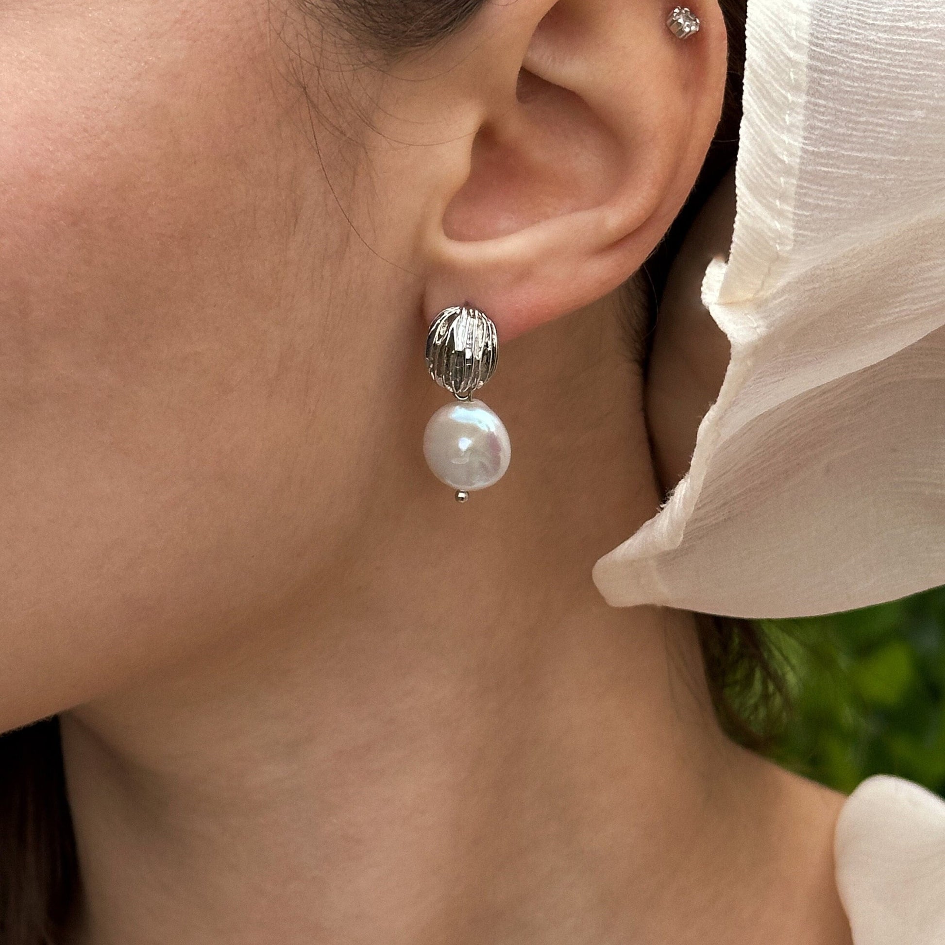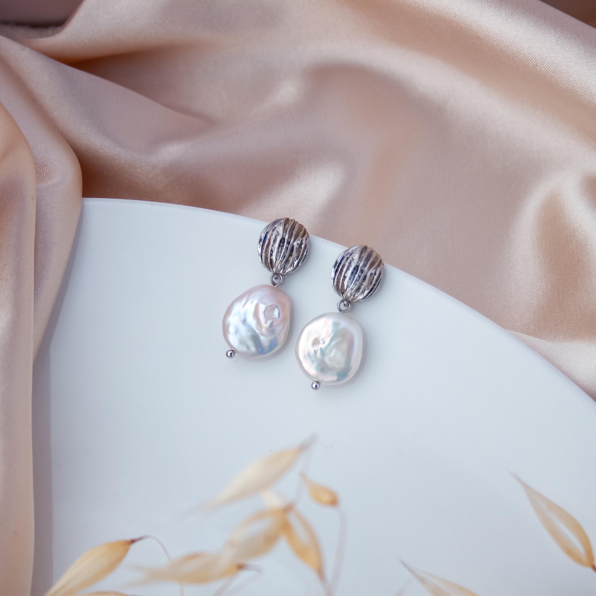 Modern drop earrings featuring flat, iridescent baroque pearls with soft organic shapes and silver-toned textured tops. Each pair reflects natural beauty and individuality, perfect for weddings, special occasions, or elegant everyday style.